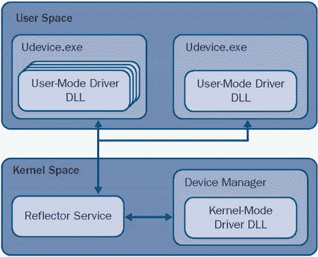 Reflector Service The service that allows user mode drivers to access the kernel and hardware by performing requests on their behalf.