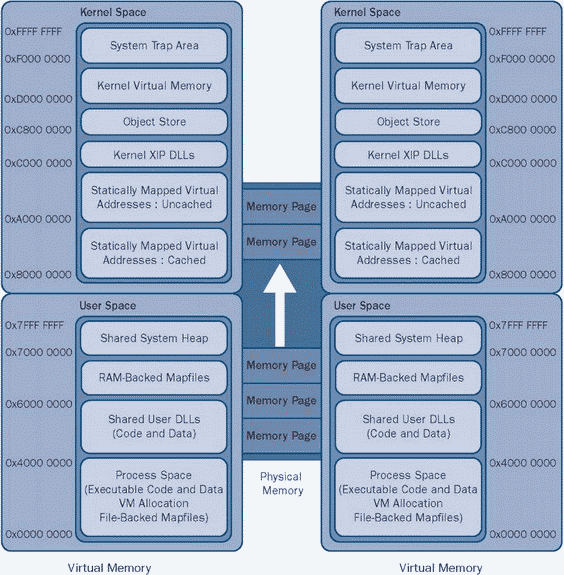 Virtual Memory Virtual memory is a way of abstracting the physical memory in a system to appear contiguous to processes that use it. Each process in Windows Embedded CE 6.0 R2 has two gigabytes of virtual memory space available, and to access physical memory from a process this memory must be mapped into the virtual address space of the process using MmMapIoSpace or OALPAtoVA.