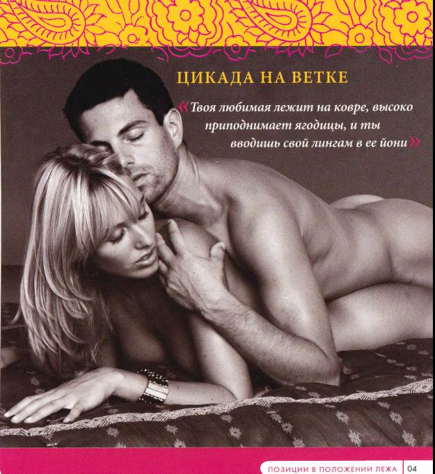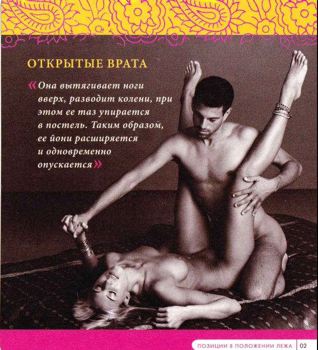 ПОЗИЦИЯ ДЛЯ НЕЕ: Простирая навстречу ему йони, она демонстрирует свое намерение и тем самым усиливает его желание. В таком положении стимулируется также клитор. Оргазм у нее будет более ярким, если дополнительно стимулировать клитор рукой. Если в этой позиции у нее появятся легкие спазмы в ягодицах, она должна просто прижать пятки к матрасу, подняв стопы вверх. Не делайте, пожалуйста, никаких лишних захватов — только ваш таз приподнимается вверх.