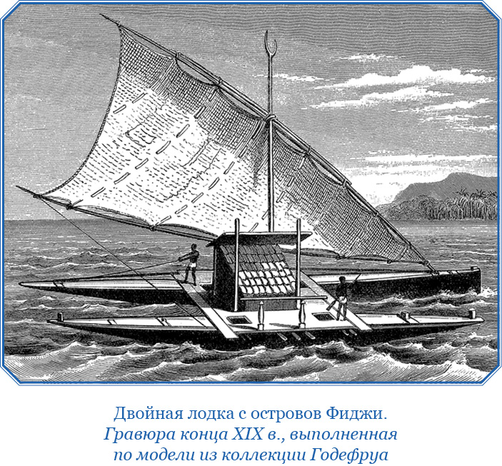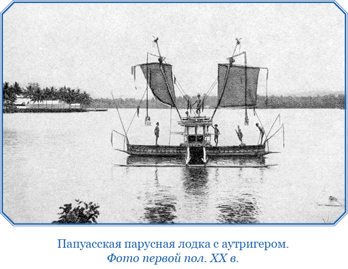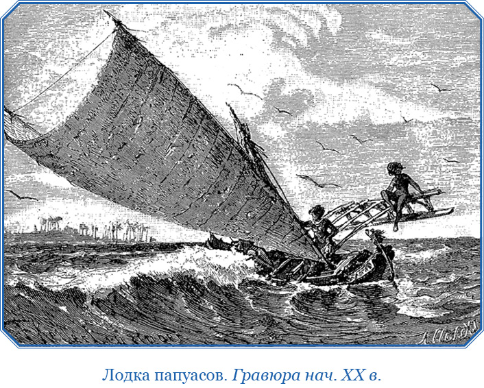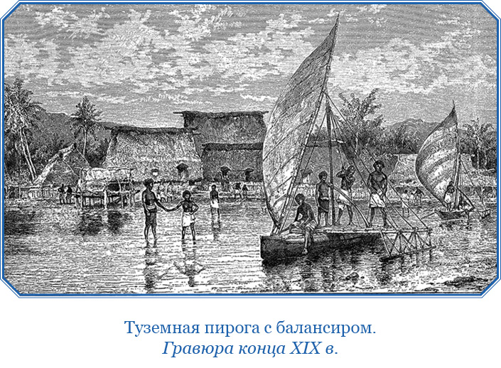 Шлюпки у них все долбленые, с балансирами и различных величин. Есть большие пироги с мачтами и парусами, сделанными из циновок и привязанными к бамбуковому рейку. Вантина у мачты с одной стороны, а именно – со стороны балансира, так что когда ходят под парусами, всегда подымают парус с одной стороны, поэтому образование носа и кормы пироги совершенно одинаковые.