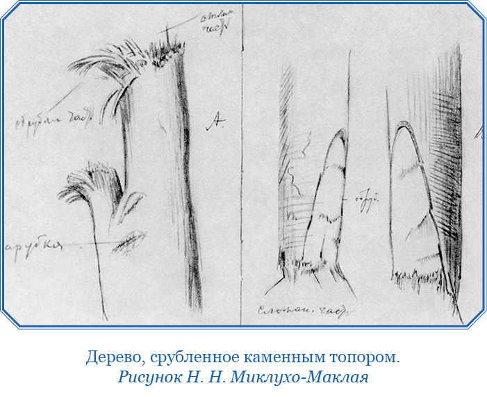 Я указал между прочим командиру и офицерам место, где я зарою в случае надобности (серьезной болезни, опасности от туземцев и т. п.) мои дневники, заметки и т. д.[14] Место это находилось под большим деревом, недалеко от хижины; чтобы легче было найти его, на соответствующей стороне ствола кора была снята приблизительно на один фут в квадрате и вырезана фигура стрелы, направленной вниз.