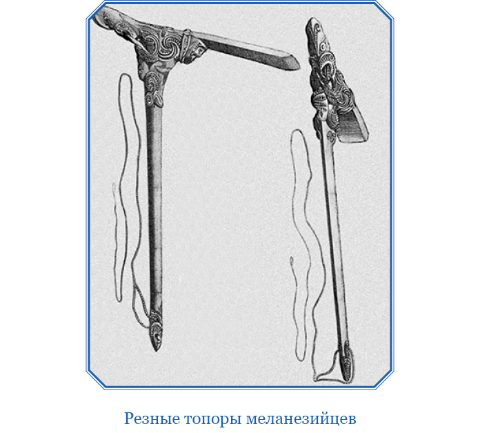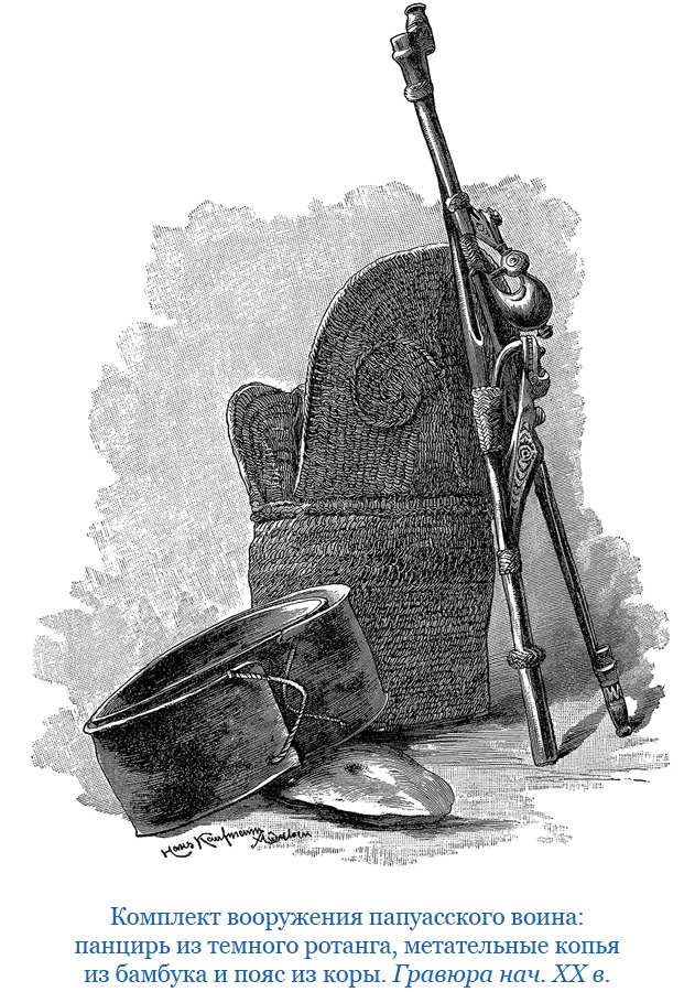 Оружие их составляют копья и луки из железного дерева, а стрелы – из камыша с бамбуковыми или тоже железными наконечниками. Некоторые из них отравленные, т. е. намазанные ядовитым составом красноватого цвета. Топорики у них каменные, рукоятка деревянная, сучковатая, имеет вид цифры 7; в более толстый и короткий конец вставляется заостренный камень вроде кремня, и потом этот конец обматывается бамбуковой тесемкой.