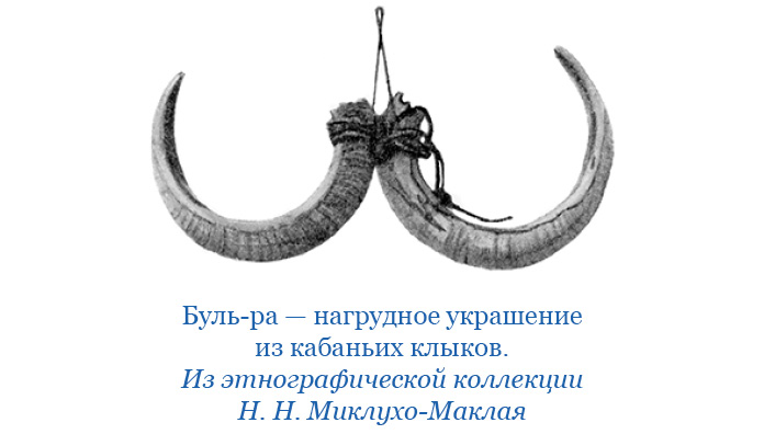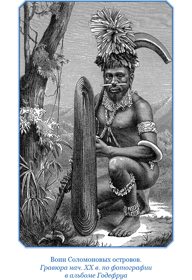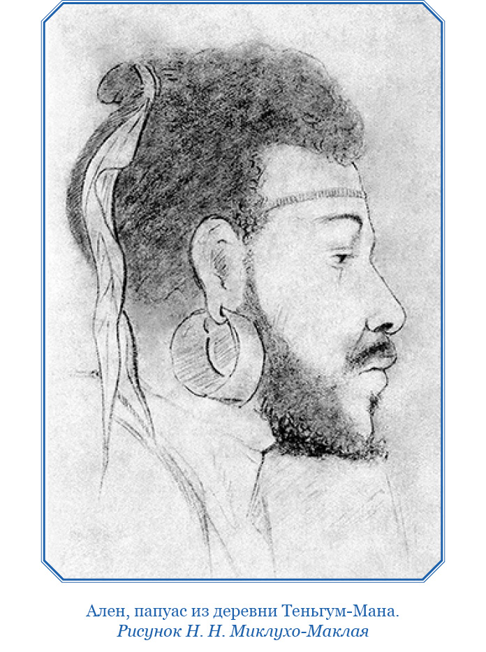Локоны эти висели за ушами и спускались до плеч. В волосах торчали два бамбуковых гребня, на одном из которых, воткнутом на затылке, красовалось несколько черных и белых перьев (казуара и какаду) в виде веера. В ушах были продеты большие черепаховые серьги, а в носовой перегородке – бамбуковая палочка, толщиной в очень толстый карандаш, с вырезанным на ней узором. На шее, кроме ожерелья из зубов собак и других животных, раковин и т. д., висела небольшая сумочка, на левом же плече висел другой мешок, спускавшийся до пояса и наполненный разного рода вещами.