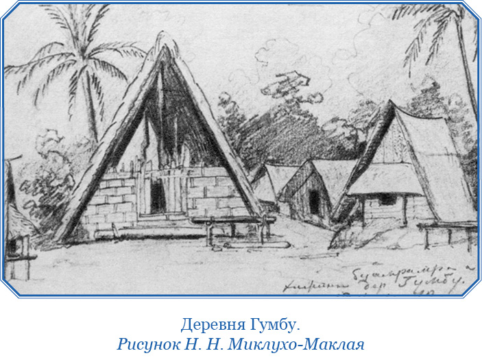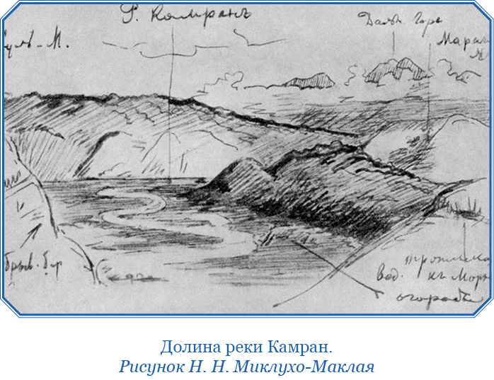 На предложенный мне командиром корвета «Витязь» капитаном второго ранга Павлом Николаевичем Назимовым вопрос, в каком месте берега я желаю быть высаженным, я указал на более высокий левый берег, предполагая, что правый, низкий, может оказаться нездоровым. Мы долго вглядывались в берег залива, желая открыть хижины туземцев, но, кроме столбов дыма на холмах, ничего не заметили. Подойдя, однако, еще ближе к берегу, старший офицер П. П. Новосильский закричал, что видит бегущих дикарей. Действительно, можно было различить в одном месте песчаного берега несколько темных фигур, которые то бежали, то останавливались.
