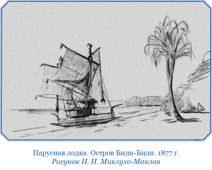 Я взял кое-что, но так мало, что П. Н. Назимов очень удивился и предложил мне весьма любезно уделить многое из своей провизии, которую я принял с благодарностью и которая могла мне пригодиться в случае болезни. Он оставил мне также самую малую из шлюпок корвета, именно четверку, с которой в крайности может управиться и один человек. Иметь шлюпку было для меня удобно в высшей степени, так как при помощи ее я мог ознакомиться с другими береговыми деревнями, а в случае полной неудачи добиться доверия туземцев она же давала мне возможность переселиться в другую, более гостеприимную местность.