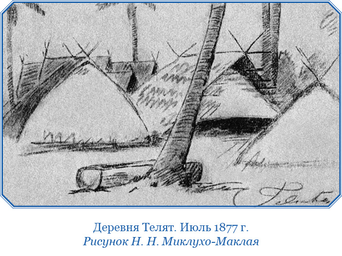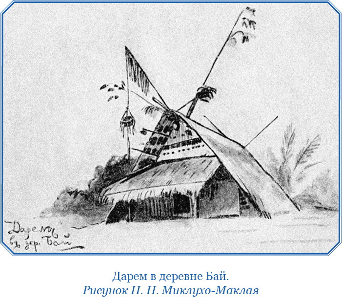 В этот день на корвете должен был быть молебен по случаю дня рождения Вел. кн. Константина Николаевича и установленный пушечный салют; поэтому я решил остаться в деревне среди туземцев, которых сегодня набралось несколько десятков, чтобы моим присутствием ослабить несколько страх, который могла произвести на туземцев пальба.