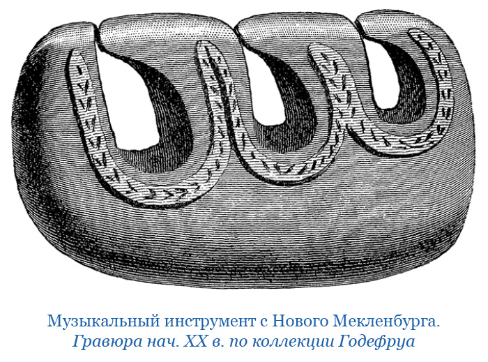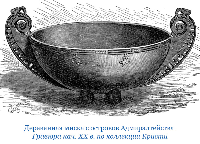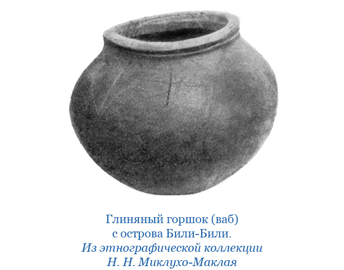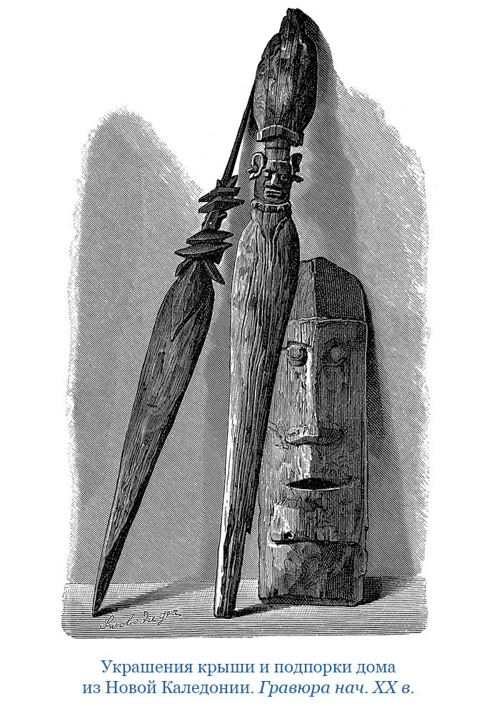 Из домашней утвари видели много деревянных лоханок различной формы, овальных, в виде корыт, и круглых с ручками, довольно глубоких и с резьбой; точно так же мы нашли у дикарей глиняные горшки различных величин и форм и сети для ловли рыб, великолепно сплетенные из крученых ниток, сделанных из какого-то дерева, которые с большим трудом можно отличить от льняных. В некоторых избах висят в углу или просто валяются человеческие черепа. Вообще все избы очень грязно содержатся. Есть несколько шалашей в виде длинных сквозных сараев, служащих, по всей вероятности, местом их сходок, а может быть и храмов, так как в некоторых мы видели по нескольку идолов различной величины.
