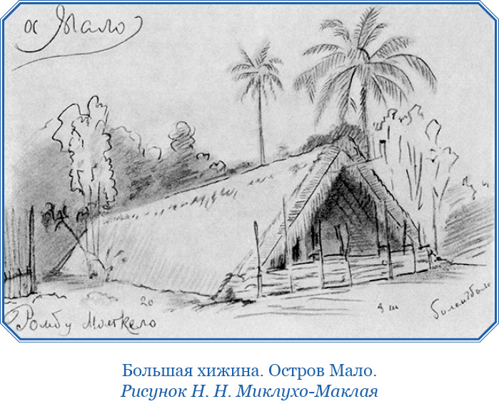 Г. Миклухо-Маклай, решившись остаться на Новой Гвинее, выбрал себе место в порту Вел. кн. Константина, на одном мыске, возле речки. Наши столяры и плотники соорудили ему прехорошенький маленький домик на сваях; команда очистила место возле дома и сделала большую площадку, кругом которой из срубленных деревьев, кустарников и колючего хвороста устроили ограду, так что дикари ни с которой стороны не могут подойти к дому, не быв замеченными.