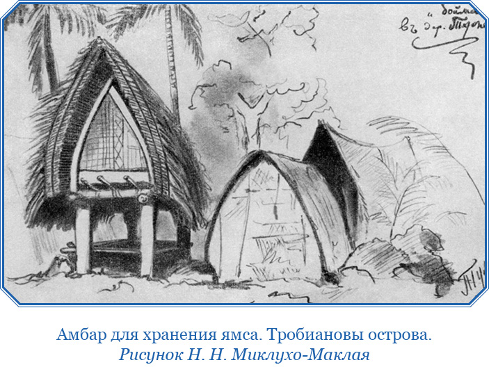 Для хранения вещей и провизии были вырыты погреба; маленький шалаш возле дома будет служить ему кухней, мальчик с острова Ниуе предназначен быть поваром, а другой, швед Вильсон, как более смышленый, будет находиться при г. Маклае.