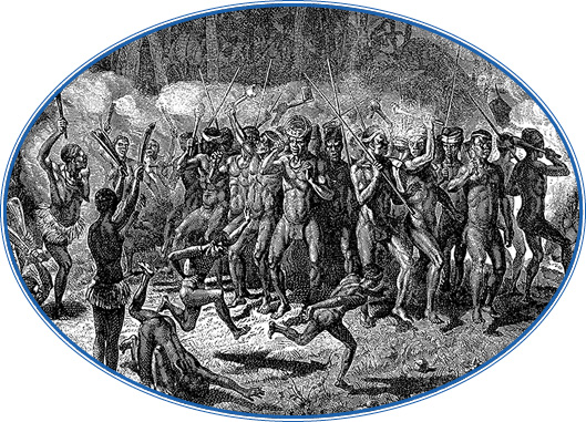 В это время, откуда ни возьмись, явились пять человек дикарей, которые стали поперек дороги и, не желая пускать нас дальше, стали сперва стращать, показывая, что в деревне нас съедят; будучи вооружены, острастки их мы не испугались, они же, видя наше упорное желание туда пройти, стали что-то кричать в деревню, а потом принялись просить и умолять, чтобы мы не ходили в эту деревню. Не желая с ними ссориться, мы вернулись назад, дикари нас долго провожали и очень ласково распрощались; видно было, что они были очень довольны, что мы не пошли в их заколдованное место; по всей вероятности, там находились их жены и дети.