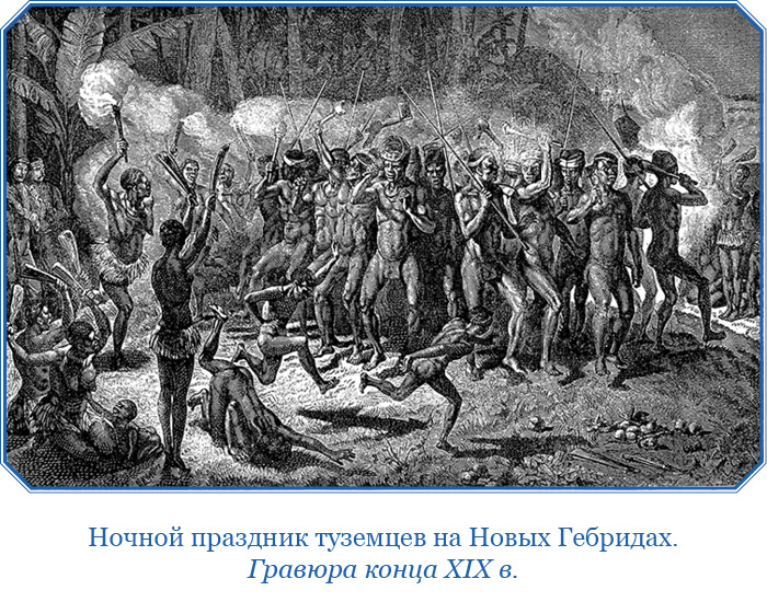 Мы увидели первую группу дикарей, вышедших боязливо из-за этого мыска. Впереди шел начальник, а за ним попарно остальные; они подошли к ближайшему от нас берегу, принесли какие-то дары, которые сложили в кучу на берегу, прокричали что-то, показывая руками на кучу, и медленно удалились за мысок.