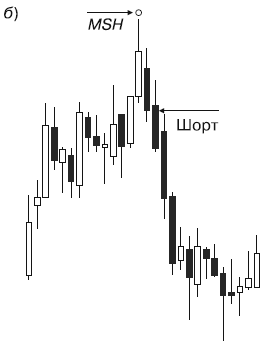 После того как образовалась модель MSH, открываем короткие позиции, когда цена закрытия третьего бара ниже закрытия бара предпоследнего в растущем ценовом движении.