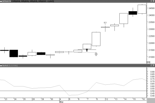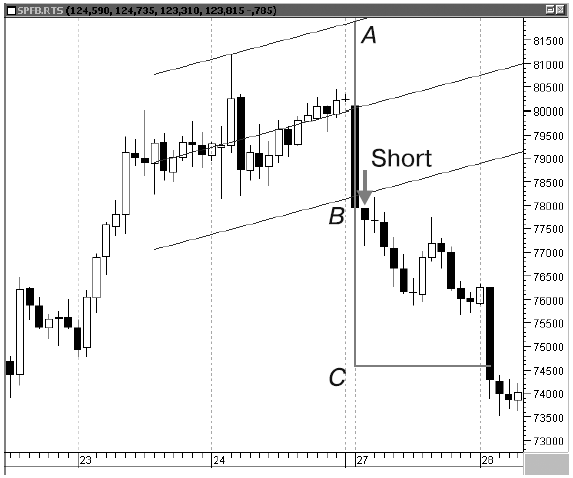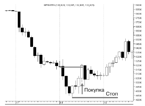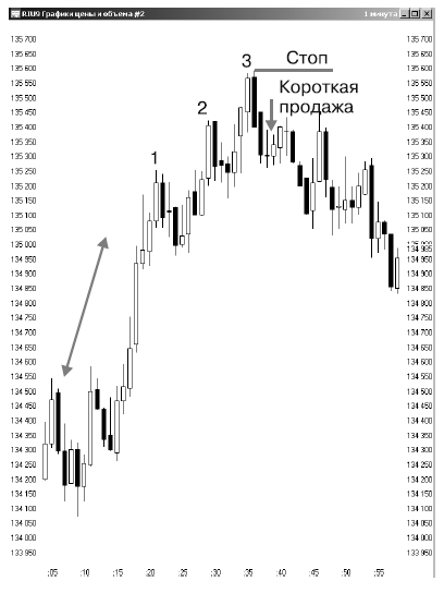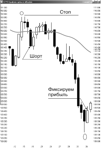 Рисунок 5 иллюстрирует фигуру MSH на минутном графике. Возможность открытия короткой позиции предоставилась 9 июля 2009 г. по фьючерсу на индекс РТС. Цены росли и встретили сопротивление на уровне 50-периодной скользящей средней. Здесь и была сформирована графическая модель MSH. После того как цена закрытия свечи оказалась ниже закрытия предпоследней свечи роста, мы вошли в рынок.