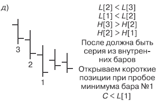 Модель состоит из трех свечей или баров. Но на практике она может состоять и из пяти-шести свечей. Расширение модели идет за счет внутренних дней. Это бары, которые по своей величине и местонахождению не выходят за рамки предыдущей свечи, что дополнительно усиливает сигнал от данной модели (рис. 4).