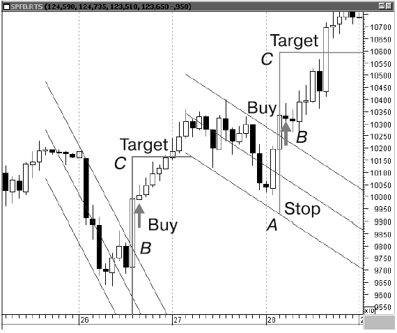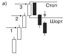 При открытии длинных позиций стоп-приказы должны быть помещены на минимуме трехбарной модели, на самой низкой цене из трех баров. При открытии коротких позиций на максимуме трехбарной модели – выше самого высокого уровня в трех барах.