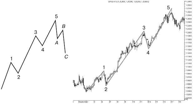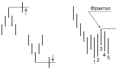 «Рыночную структуру» хорошо видно на свечном графике. «Рыночная структура вершины» формируется из свечки, чье закрытие идет выше прошлого закрытия. И после этого появляется свеча с закрытием ниже закрытия второго дня до этого. «Рыночная структура донышка» является зеркальным отражением (рис. 3).