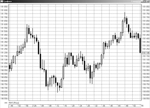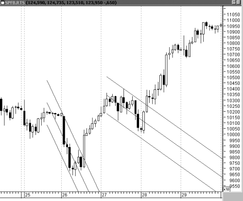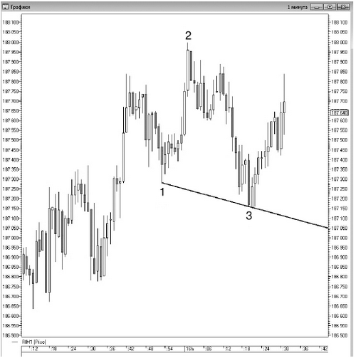 Рисунок 9 иллюстрирует модель «совпадающие вершины» на минутном графике цены фьючерса на индекс РТС. Через полторы минуты произошел пробой этого минимума фигуры, и соответственно появилась удачная возможность для открытия коротких позиций.