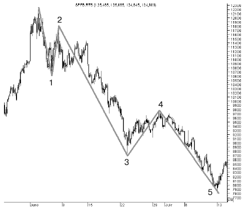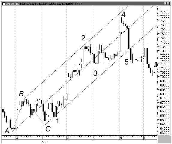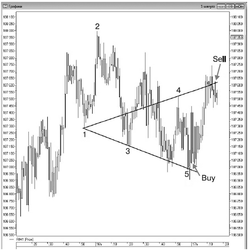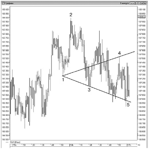 Хотя фигура образовалась на падении, мы тоже сможем ею воспользоваться. Отмечаем вершину цифрой «2» и смотрим по бокам минимумы. Главное, чтобы минимум «3» был ниже предыдущего донышка «1». Потом ждем точку № 5 и открываем лонг, как только цена пробила максимум бара, на котором было достигнуто минимальное значение. И на минимуме ставим свой стоп. Цель определяем на линии, проведенной из точки «1» через точку «4». Открыв лонг по 188 380 и выставив стоп на 188 170, мы зафиксировали прибыль на 189 100 пунктах по фьючерсу на индекс РТС (рис. 113).