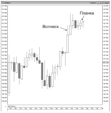 Как говорит само название, на рынках появился всплеск цены, после которого цена замерла в нерешительности: то ли ей продолжать движение, то ли развернуться. После застоя цены высока вероятность, что цена пойдет против предыдущей тенденции, и на этом стоит подзаработать (рис. 104).