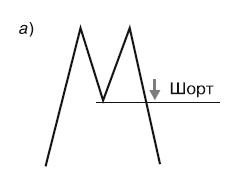 Открыть короткие позиции можно в двух вариантах. Первый – если цена пробивает минимум между последними двумя вершинами. И второй – когда цена пробивает самый низкий минимум, который образовался между тремя вершинами.