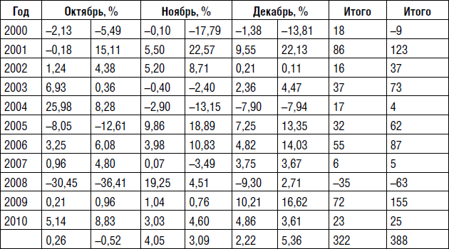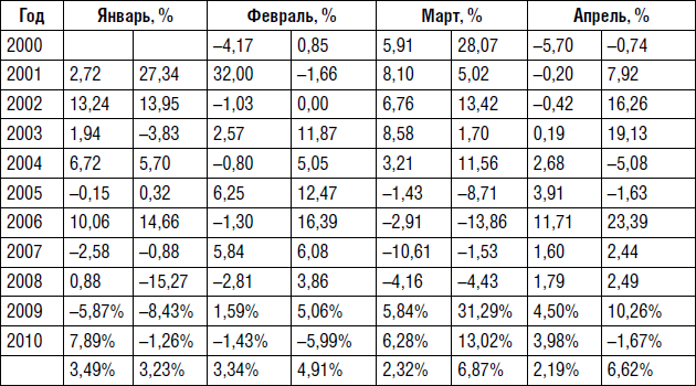 Идея с ростом в первых числах месяца хорошо показала себя, когда общее изменение доходности рынка находилось в пределах 20 %. В годы с серьезным ростом рынок рос и в остальные дни. Встает вопрос, а как будет в будущем? Можно предположить, что замеченная Коннорсом закономерность приходилась на период развитого рынка, когда общие изменения по году не столь значительны. А я исследовал российский рынок во времена его недооцененности, и соответственно на рынке присутствовали большие бычьи тенденции. Даже 2009 г. стоит исключить из выборки, так как на него приходилось восстановление рынка после кризиса. Заглядывая в будущее, стоит говорить, что и наш рынок будет вести себя так же, как в развитых странах, так как стоимость наших предприятий уже достигает стоимости аналогичных предприятий на Западе. Исчез такой фактор для роста, как недооцененность. Таким образом, интересными для нашего анализа остались только два года – 2007-й и 2010-й. А вот как раз на них подтвердилась закономерность, подмеченная Коннорсом.