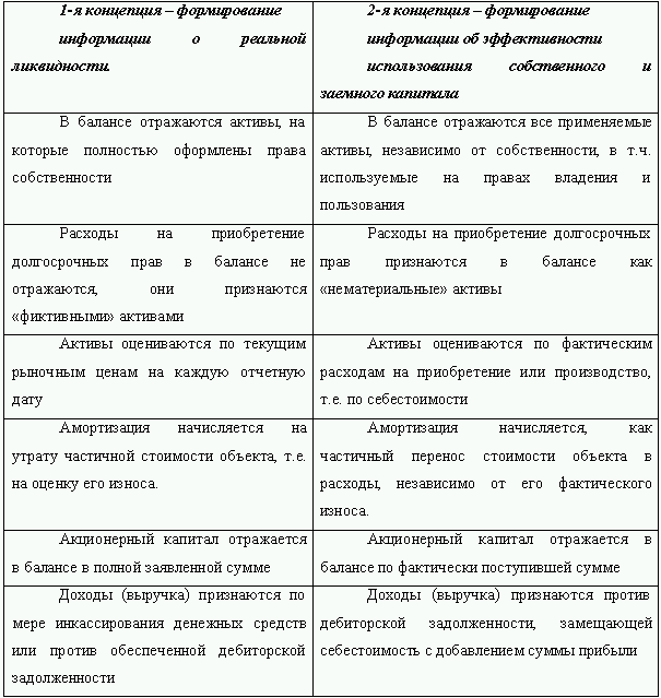 Приведем коренные отличия двух концепций бухгалтерского учета в нижеследующей таблице:[30]