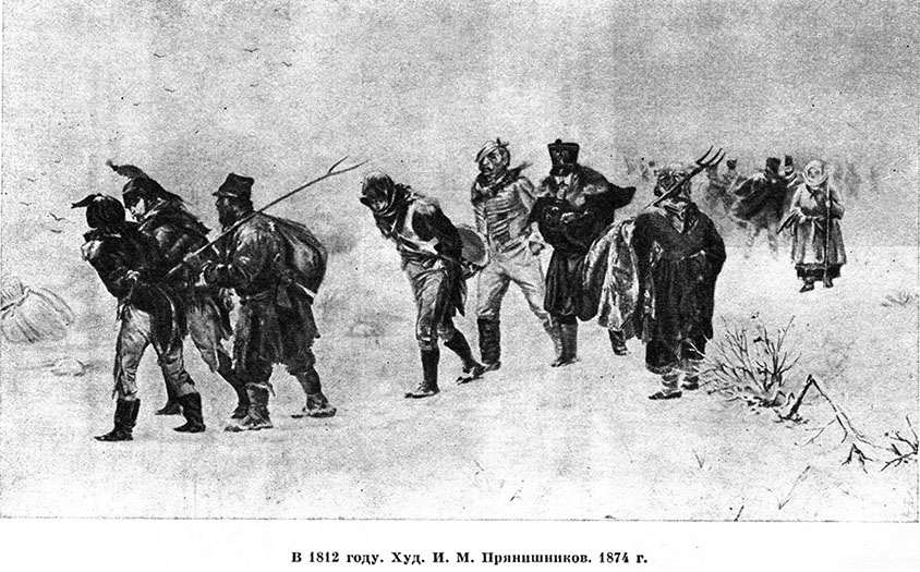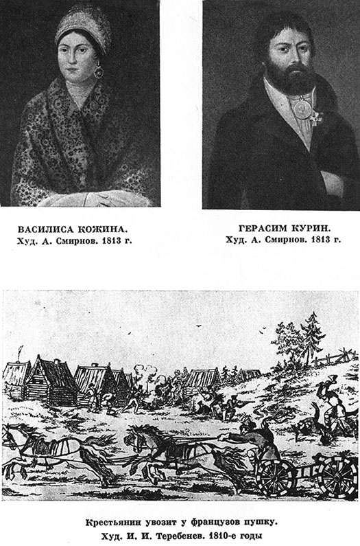 Чем дальше в глубь России шла армия Наполеона, тем сильнее становилось сопротивление народа. «Война 1812 г. пробудила народ русский к жизни и составляет важный период в его политическом существовании, — писал декабрист И. Д. Якушкин, участник Отечественной войны. — Все распоряжения и усилия правительства были бы недостаточны, чтобы изгнать вторгшихся в Россию галлов и с ними двунадесять языцы, если бы народ по-прежнему остался в оцепенении … Мне теперь еще помнятся слова шедшего около меня солдата: „Ну, слава богу, вся Россия в поход пошла!“ В рядах даже между солдатами не было уже бессмысленных орудий; каждый чувствовал, что он призван содействовать в великом деле».[49]
