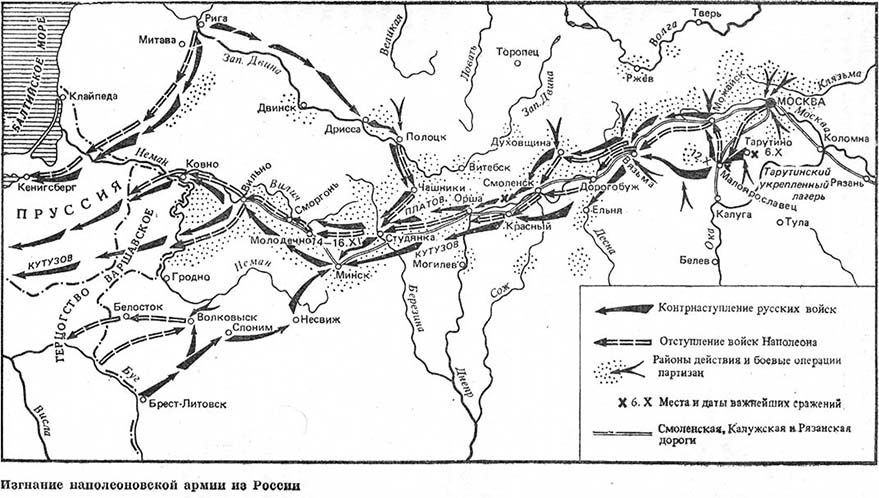 Молниеносная война против России была необходима Наполеону. Его огромная армия была уже значительно утомлена длительными войнами, а главное Наполеон не мог рассчитывать в затяжной войне на стойкость и выносливость солдат из порабощенных им европейских стран, составлявших около половины «Великой армии». Учитывая изолированность друг от друга всех трех русских армий на западном театре военных действий, Наполеон стремился еще больше разъединить и разбить их поодиночке. Под давлением намного превосходящих сил противника русские войска вынуждены были отступать. Стремительным овладением Вильны предполагалось рассечение армии Барклая-де-Толли, закрытие ей дороги для движения в глубь страны. Наполеон был уверен, что, втянув эту армию в сражение, он уничтожит ее основные силы и откроет себе путь к быстрому победоносному завершению войны. Но Наполеону не удалось осуществить свой замысел — навязать русским военным силам генеральное сражение уже в приграничной полосе. Как писал бывший французский посол в Петербурге, во время войны 1812 г. находившийся при Наполеоне, генерал Коленкур, «потерять надежду на большое сражение перед Вильно было для него все равно, что нож в сердце».[42]