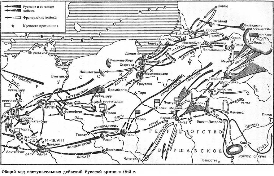 В войне против России, как и в своих предшествовавших ей захватнических войнах, Наполеон делал ставку на стремительность нападения, на достижение победы над противником в генеральном сражении. «Надо покончить этот поход одним громовым ударом», — подчеркивал французский император, начиная вторжение в Россию. От своих полководцев он требовал смелых и решительных действий, подчинения в сражении всех других целей главной — уничтожению массы неприятельских войск. Тогда, считал Наполеон, «все остальное рухнет вместе с ними». В разработке стратегии и тактики генерального сражения он считал себя последователем многих выдающихся полководцев мира, в их числе Цезаря, Александра Македонского и Ганнибала. Наполеон, действительно, во многом следовал их «правилам» «держать свои силы в совокупности … устремляться с быстротою на важнейшие пункты, использовать моральный фактор, славу оружия, страх …».[41] Все эти факторы, по его мнению, обеспечивали не только победу в сражении, но и должны были удержать в повиновении покоренные народы.