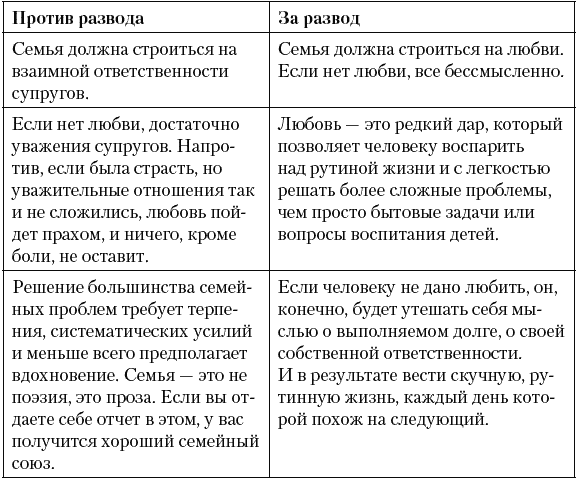 На языке детей эти вопросы формулируются по-другому и сводятся к одному: «А что, теперь папа и мама, дедушка, бабушка больше не будут меня любить?» Для ребенка семья – это собрание источников любви, а ее разрушение означает, что теперь этих источников становится меньше. Это и создает панику у маленьких детей. У них конкретно-образное мышление – они еще не понимают значения денег. Они не могут поддержать разговор на тему «папа – безответственный негодяй». Но они четко реагируют на уровень тревожности близких и на приближение опасности. Ниже мы поговорим еще о том, какие вопросы волнуют детей и как на них отвечать. А пока, если вы еще не приняли решение разводиться, давайте подумаем, стоит ли это делать и как можно этого избежать (в том числе и при помощи вашего малыша).