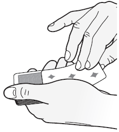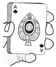 1. Допустим, туз пик — нижняя карта колоды, и вам нужно убедить аудиторию, что вы сдаете ее на стол. Держите колоду в левой руке, большой палец на одной длинной стороне, а указательный, средний и безымянный — на другой. Мизинец поддерживает колоду, в то время как вы показываете ее аудитории (см. рисунок).