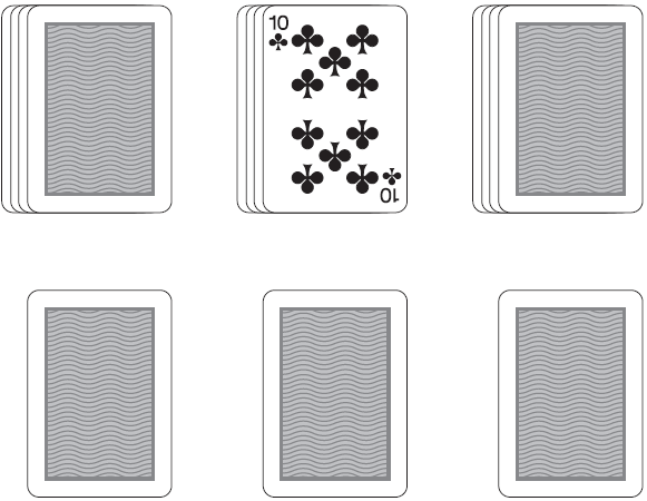 1. Десять карт выкладываются в соответствии со значками масти на десятке (см. рисунок). Ваш сообщник, как и в фокусе «Одна против восьми», — Евгения (так как одного сообщника вполне достаточно любому фокуснику). Евгения, конечно, знает карту, к которой прикоснулся зритель (назовем его Леонид).