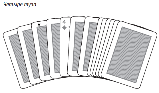 Другой способ — переместить туза пик вверх, а затем путем тасования снова вниз. Как это сделать, рассказано в следующих двух фрагментах о ложной тасовке. Конечно, для этого нужны две операции вместо одной, но если вы уже освоились с этими приемами — почему бы и не попробовать?