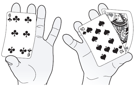 2. Разговаривая с публикой, например рассказывая ей, как называется следующий фокус, держите карты в правой руке, с ладонью слегка опущенной вниз, так чтобы нижняя карта «смотрела» на ваш левый ботинок. Большой палец охватывает карты с ближайшего к вам торца, второй и третий пальцы держат другой торец, а указательный палец находится в центре верхней карты.