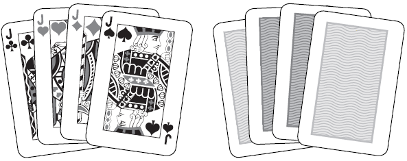 Помните, что колоды карт — это ваши инструменты; неплохо иметь две или три колоды одинакового дизайна, чтобы можно было поместить фальшивую карту в нужное место «правильной» колоды (пара фокусов в этой книжке предполагает использование запасной карты в качестве ложной). Используйте карты с белой каемкой на рубашке. Это позволит вам смешать карты, смотрящие вниз рисунком, с картами, смотрящими вверх, в колоде, выровненной не до конца.