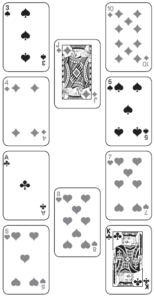 Вот так должны быть выложены девять карт. Обратите внимание, как значки масти на девятке пик аккуратно отображают расклад в целом