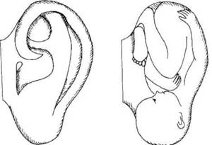 Замеченное французским врачом Ножье сходство формы уха и эмбриона человека позволило ему сознательно использовать это подобие для поиска целебных точек и способствовало дальнейшему развитию акупунктуры на ушной раковине (рис. 1).