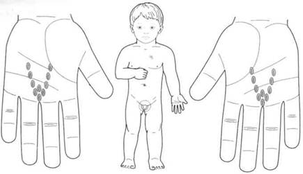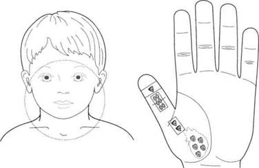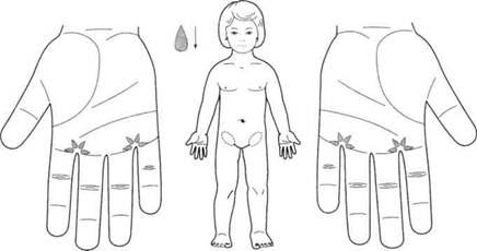 Мальчик трех лет. Беспокоят повышение температуры до 39°С и боль в горле. Проведена аппликация семян чечевицы на точки соответствия горлу в системе «насекомого». Поставлены также семена черной редьки на болезненные точки в зоне соответствия голове (рис. 122). Ребенок заснул во время массажа семенами чечевицы точек соответствия горлу. Через полчаса нормализовалась температура. А наутро мальчик был здоров.