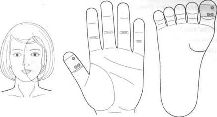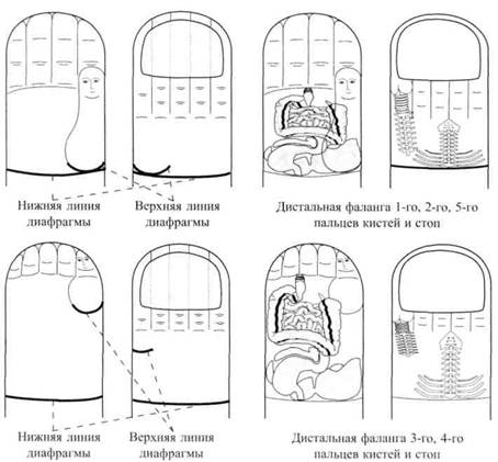 На дистальных фалангах второго и пятого, а также большого пальцев кистей и стоп находятся мини-системы соответствия телу, повторяющие по форме стандартную систему соответствия кисти; на дистальных фалангах третьего и четвертого пальцев кистей и стоп находятся мини-системы соответствия телу, повторяющие стандартную систему соответствия стопы (рис. 23).