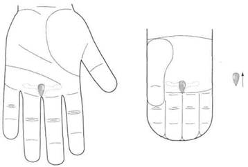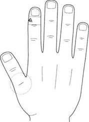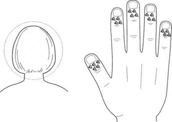 Девушка, 18 лет. Сильная боль в пятом верхнем зубе справа. Поставлено одно семя гречки на болезненную точку соответствия в дополнительной системе соответствия голове, в которой лицо проецируется на Ян-поверхность ногтевой фаланги пальца (рис. 129). Боль прошла после массажа семечком и больше не появлялась. С трудом удалось заставить девушку пойти к стоматологу на третий день.