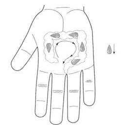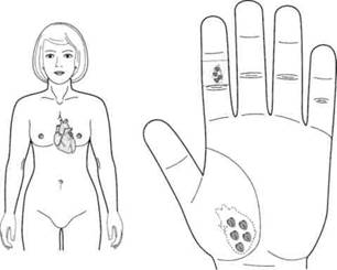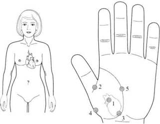 Пациентка Г., 58 лет. Обратилась с жалобами на приступы синусовой тахикардии, беспокоящие чаще по ночам, которые плохо купировались медикаментозными средствами. Лечение проводилось семенами калины. Приступы стали намного реже. А если приступ все-таки появлялся, то быстро проходил при постановке семян калины на точки соответствия сердцу в стандартной системе соответствия кисти (рис. 126).
