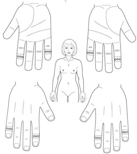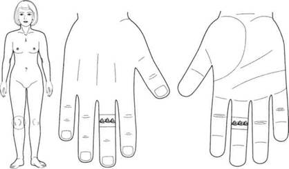 Пациентка 3., 50 лет. Обратилась с жалобами на онемение кистей рук по ночам в течение трех последних лет. Лечение проводилось зернами чечевицы в зонах соответствия лучезапястным суставам (рис. 124). Онемение наблюдается значительно реже.