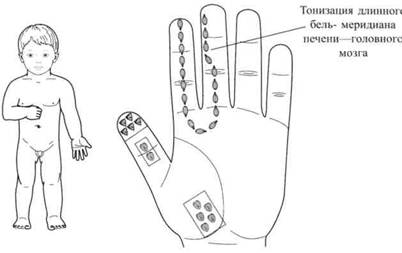 Пациентка В., пятилетний ребенок. Обратилась мама с жалобами на то, что ее дочка часто бывает раздражительной, капризной, агрессивной. При разговоре выяснилось, что девочка с рождения страдает запорами. Для коррекции состояния ребенка применялась стандартная система соответствия кисти, в которой яблочные зерна накладывались на зоны соответствия толстому кишечнику с учетом их полярности, стимулируя перистальтику толстой кишки (рис. 137).