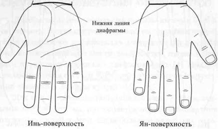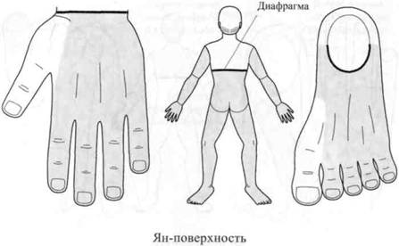 У кистей и стоп разделение на Инь— и Ян-поверхности четко выражено. Если сжать кисть в кулак, то ладонная поверхность (Инь) окажется внутри, а тыльная (Ян) — снаружи. На стопе Ян-поверхность соответствует тыльной стороне, а Инь-поверхность — подошве.