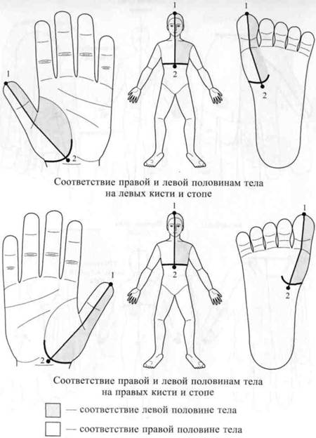Рис.19. Расположение на кистях и стопах соответствий правой и левой половинам тела выше диафрагмы