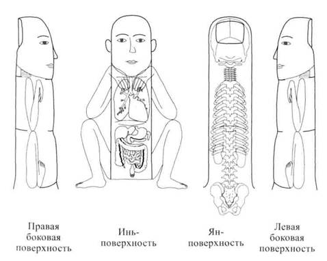 Ян-поверхность располагается на наружных поверхностях тела, ее нельзя спрятать или скрыть. Инь-поверхность занимает внутренние участки тела, она как бы скрыта. В положении человека стоя с опущенными вниз руками хорошо видны наружно-боковые поверхности рук и ног,