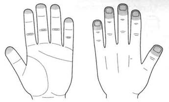 Наиболее короткой и широкой выступающей частью тела является голова с шеей, самыми длинными выступающими частями тела являются ноги, а средними по длине — руки. На кисти мы можем заметить, что самый короткий и толстый — большой палец, третий и четвертый пальцы — самые длинные, а второй и пятый занимают промежуточное положение (рис. 6).