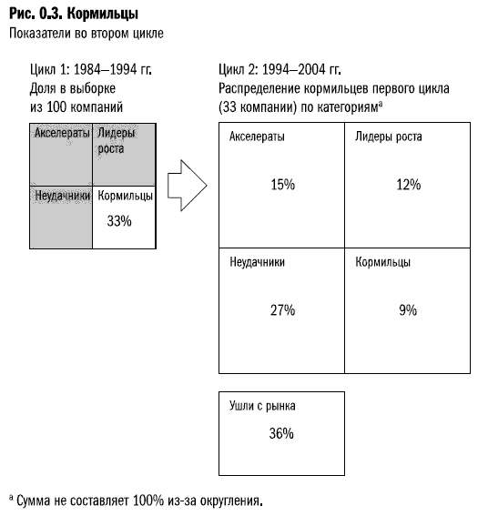 Еще более впечатляют данные на конец второго экономического цикла — 2004 г.: две из пяти компаний-лидеров (41 %) сохранили ведущие позиции (рис. 0.2). Таким образом, и в следующем цикле они опередили фондовый рынок и экономику в целом по темпам роста выручки и по доходности для акционеров.