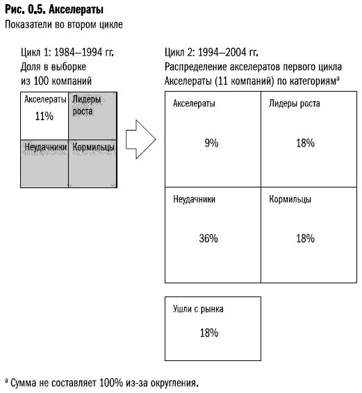 Еще 27 % сумели значительно увеличить темпы роста выручки. Четыре компании (Burlington Northern Santa Fe, Exxon Mobil, ConocoPhillips, Chevron) в следующем цикле стали лидерами роста, укрепив свои позиции путем слияний и поглощений. Оставшиеся пять компаний смогли ускорить темпы роста выручки, но им не удалось увеличить доходы акционеров, и они перешли в категорию акселератов.