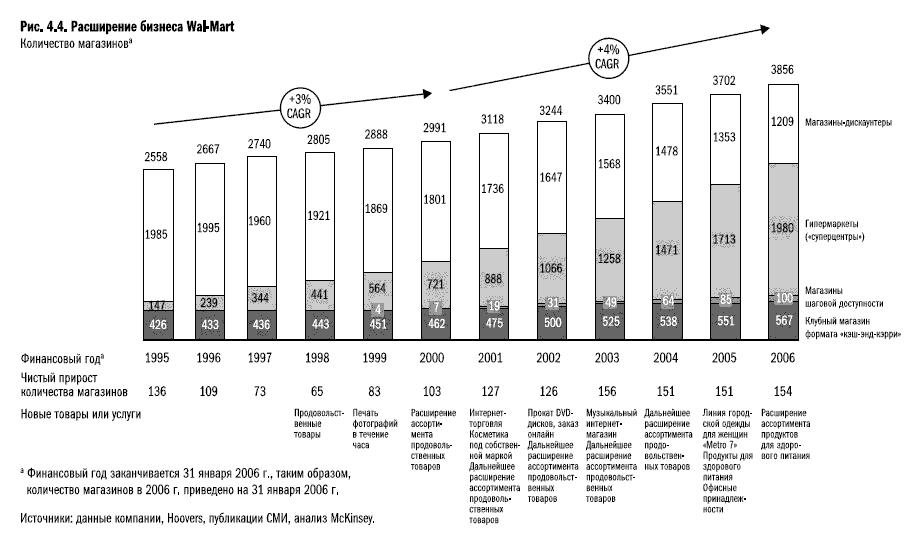 Для медианной компании в этом сегменте среднегодовые темпы роста выручки составили 9,7 %, намного выше номинального роста ВВП. Несколько компаний, в частности Wal-Mart и Intel, росли намного быстрее, сохраняя другие экономические показатели на стабильном уровне. Операционные результаты оставались стабильными для всех компаний этого сегмента; ни у одной чистая операционная прибыль за вычетом налогов не упала более чем на 2 %. Многие компании, включая Wal-Mart, Target и ряд фармацевтических фирм, расширяли свой профильный бизнес.